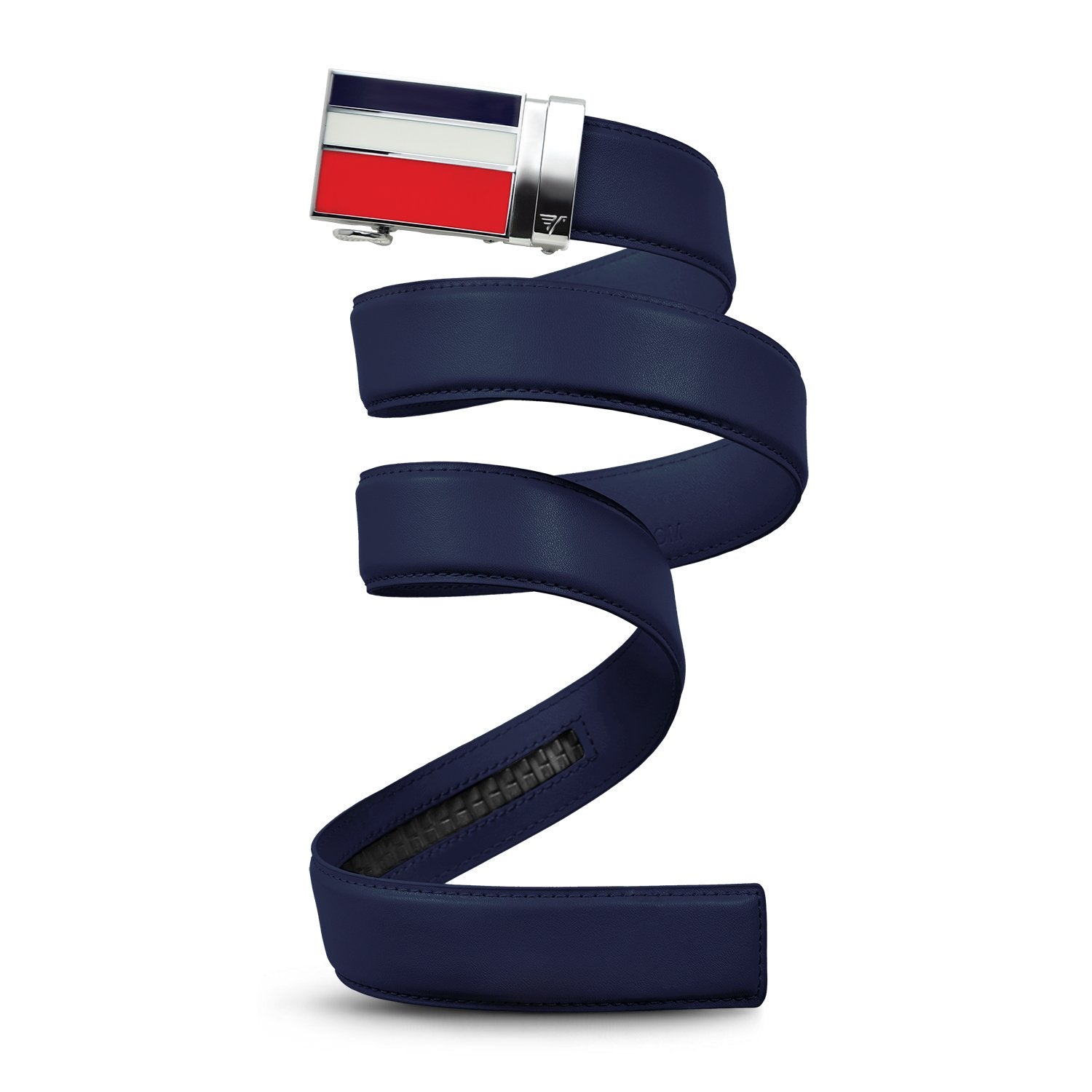 We're putting fireworks where they've never been before. Your waistband is keeping pace with Betsy Ross and apple pie in true red, white and blue fashion. White leather recommended, but you're free to express yourself with black, red, or blue leather options.