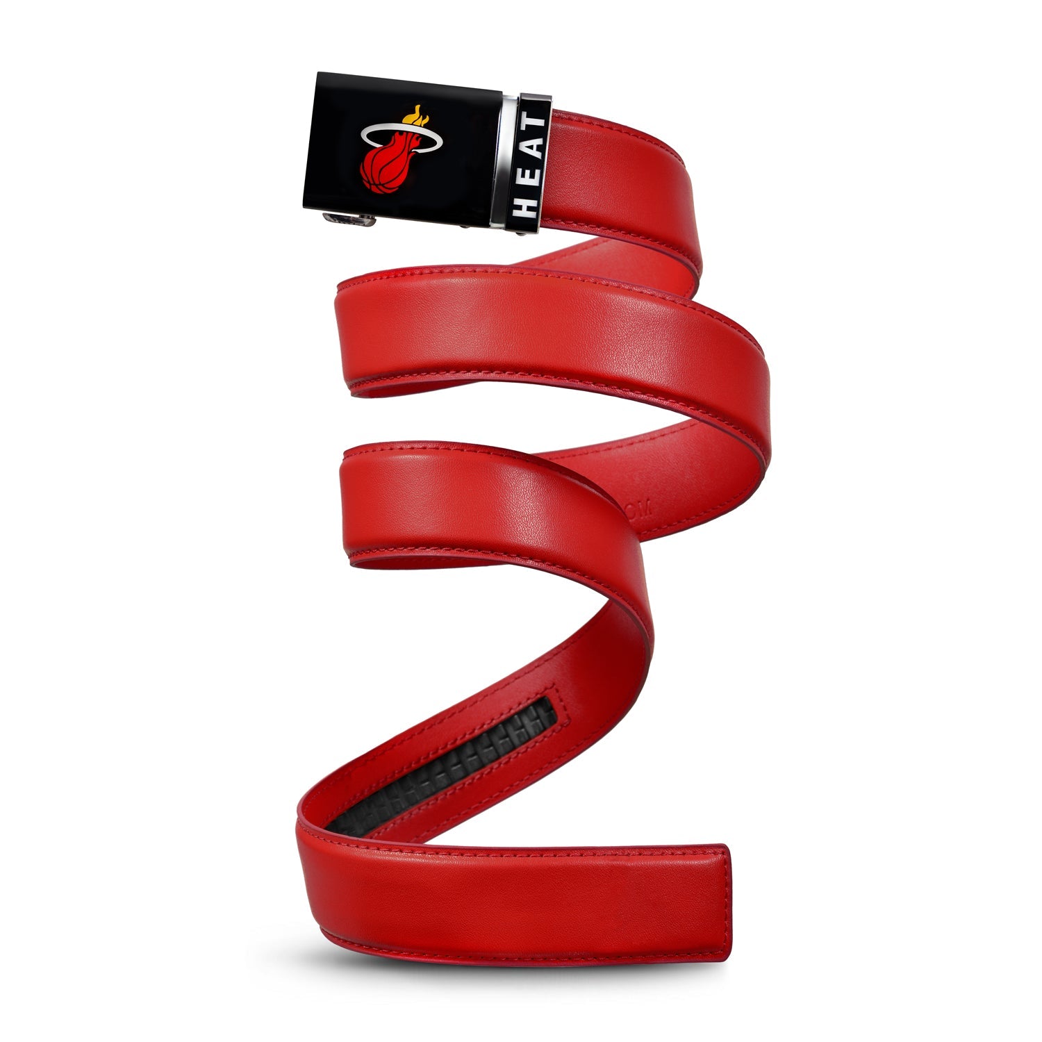 The officially licensed Miami Heat Belt from Mission Belt Co. features an imprinted team logo and team name on the buckle under a clear acrylic finish. Genuine leather strap with protective coating and the interior houses a special track which is part of the unique no-holes perfect fit system. The buckle can be detached from the leather strap so you can always trim it down to size.