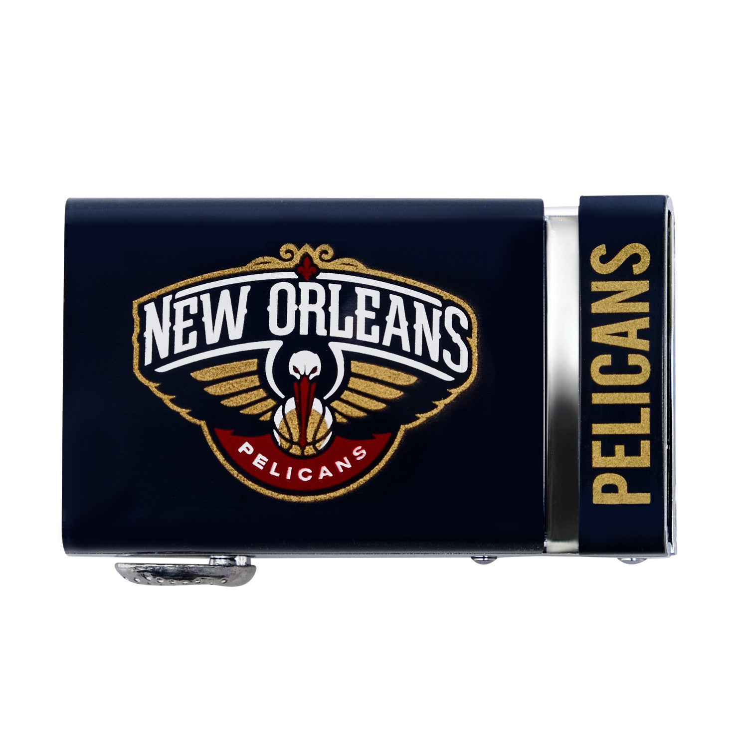 The officially licensed New Orleans Pelicans Belt from Mission Belt Co. features an imprinted team logo and team name on the buckle under a clear acrylic finish. Genuine leather strap with protective coating and the interior houses a special track which is part of the unique no-holes perfect fit system. The buckle can be detached from the leather strap so you can always trim it down to size.